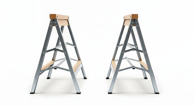 Two silver sawhorses with light wooden tops standing on a white background in a studio setting