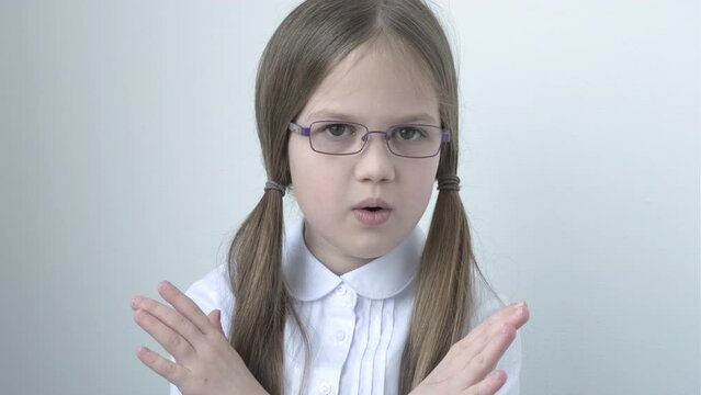 Stop. Blurred shot of little girl stretch hand show no sign mean prepare enough domestic violence bullying abuse violation of children rights. Close up focus on child palm making prohibition gesture