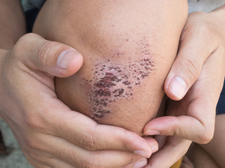 skin injury - scab and abrasion on knee of teenage boy