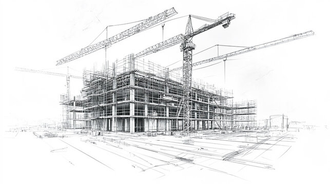 A hand drawn sketch of a construction site is illustrated in vector format