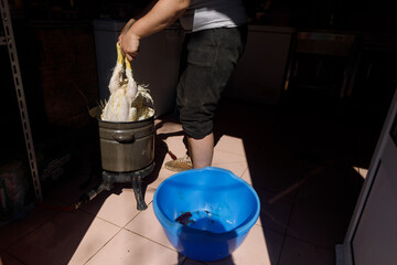 Close up while hand pulling remaining feathers from butchered broiler after animal been scald and put through plucking machine.