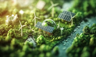 Green energy, sustainable world, eco-friendly city, renewable resources, environmental protection, miniature model, nature background