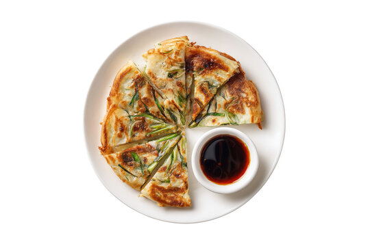 Savory korean scallion pancake with dipping sauce isolated on transparent background