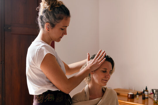 Woman receiving calming head massage for stress relief and mindfulness promotion