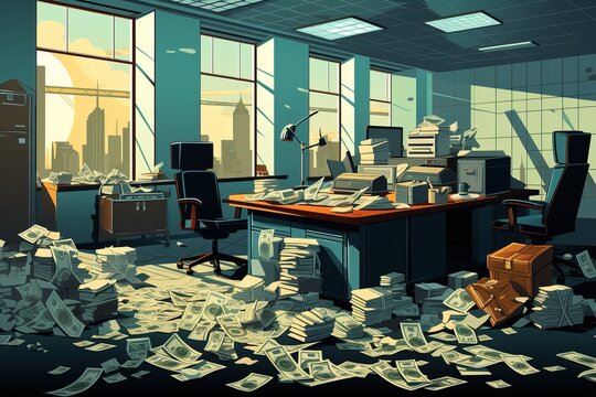 illustration of contemporary office setting with banknotes scattered on floor, conveying themes of illegal wealth and corporate scandal
