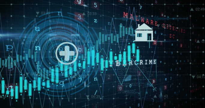 Upon world map flashing, circuit lines converging on scanner while graph pulsing processing data