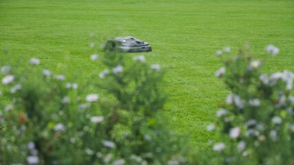 A robotic lawn mower mows the grass in a city park. High quality 4k footage