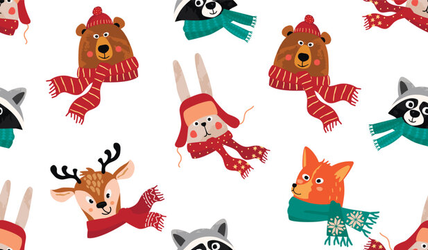 Winter holidays seamless pattern with cute forest animals in warm scarves and hats.Funny colorful  background with heads of raccoon, bear, fox, deer and hare.Vector cartoon illustration on white.