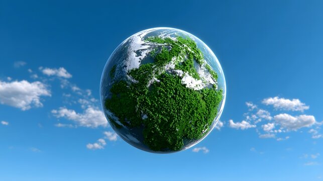 A vibrant, green globe representing the Earth's lush vegetation and ecosystems, floating in a clear blue sky with scattered clouds, symbolizing a vision for a sustainable future.