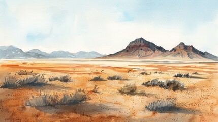 A watercolor painting depicting the Sahara Desert with towering mountains in the background. The desert is portrayed with its arid terrain and scattered vegetation under a clear sky.