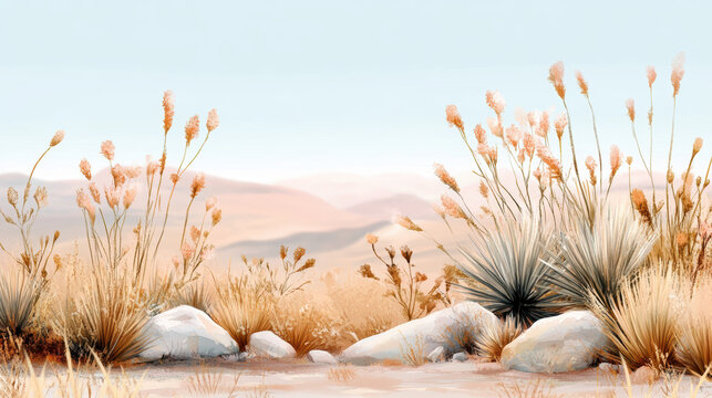 serene desert landscape with soft beige and pale pink tones, featuring dry grasses, desert plants, and scattered rocks under clear blue sky, evoking calm and tranquility