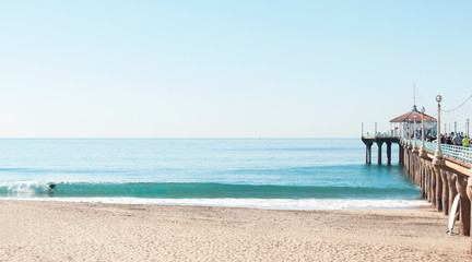 front view of seashore of Palmar Beach with sand, turquoise ocean water and horizon in Vejer village (Cadiz, Andalusia, Spain)