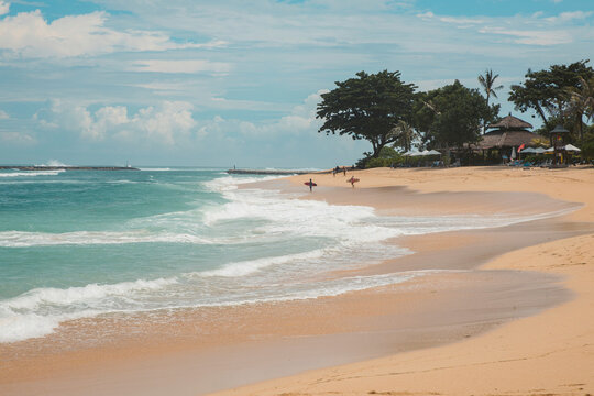 Surfers standing on the beach at the water's edge waiting for the waves at Geger Beach in the Nusa Dua resort area; Geger Beach, Badung, Bali, Indonesia