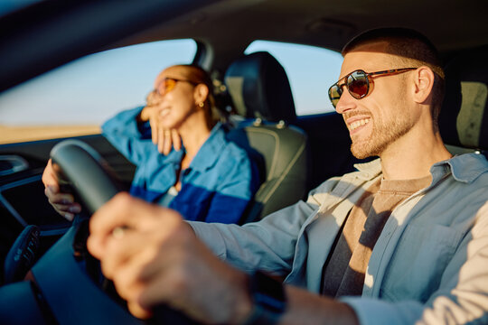 Young man and girlfriend driving through scenic landscapes during a road trip, basking in the warm glow of a beautiful sunset