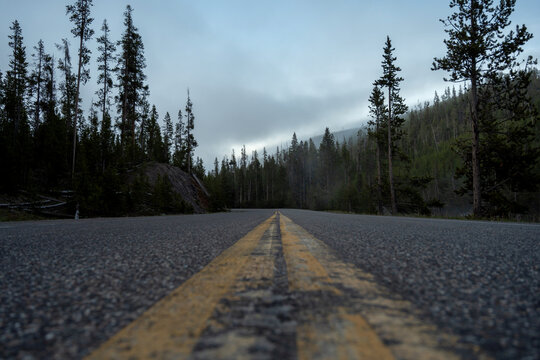 Point of view pov handheld front view of car driving on Shenandoah Skyline Drive winding road by park mountain forest in summer with green foliage trees