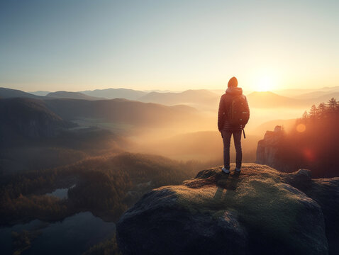 A traveler is looking towards the horizon as the sun rises over a beautiful scenic landscape. The traveler is standing on a cliff.