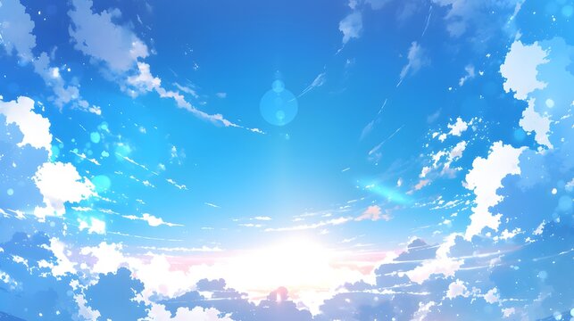 Scenic sky filled with fluffy clouds and a shining sun, bright sunny anime background