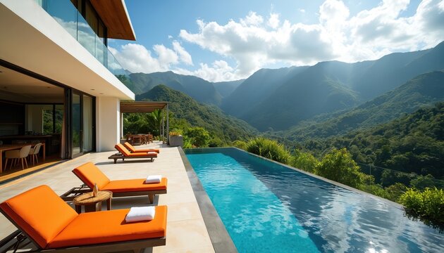 Luxurious modern villa features infinity pool with stunning mountain views in Costa Rica. Elegant architecture offers relaxation on patio loungers surrounded by rich tropical gardens and scenic hills.
