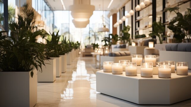 A scented candle store with an interior design that seamlessly blends white. Generative AI.