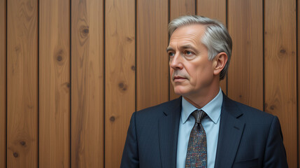 Serious senior businessman in front of wooden wall looking sideways