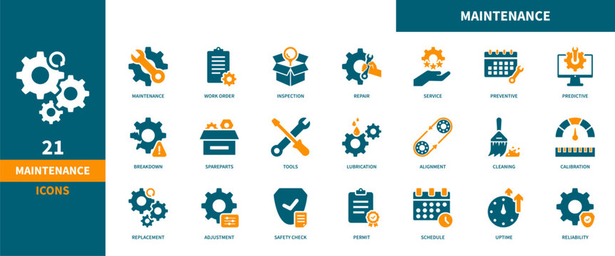 System maintenance icon set. Containing technical repair, machine support, adjustment, and service icons. Solid icon collection.