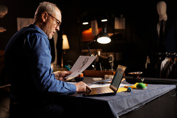 Experienced elderly tailor checking customer appointment schedule list before starting customization comission in atelier shop studio. Dressmaker working with sartorial outfit design sketch drawing