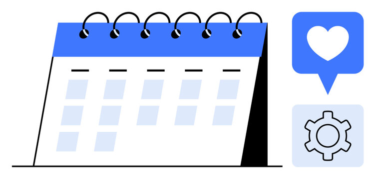Spiral-bound calendar with highlighted dates, heart notification suggesting engagement, and gear symbol for settings. Ideal for time management, event planning, reminders, priorities, customization