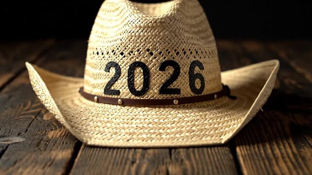 A detailed close-up shot elegantly highlights a traditional straw cowboy hat, adorned with a classic leather band featuring metallic studs. Prominently displayed on its woven crown are the bold, dark