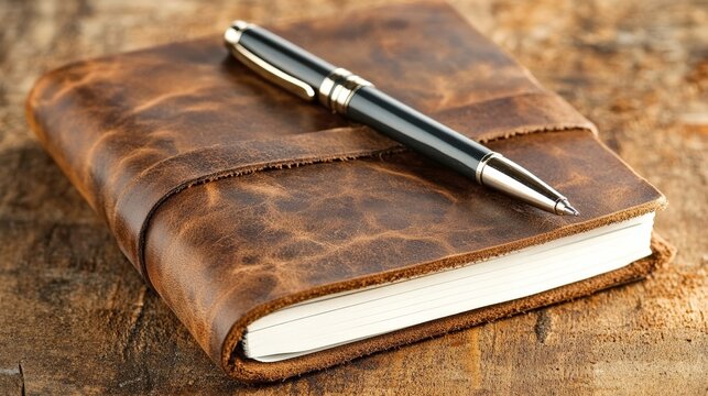 Classic wooden desk setup, pen and notebook for journaling notetaking