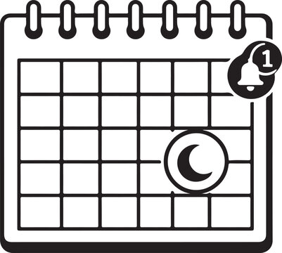 Calendar with notification bell and moon icon illustrating a scheduled event or reminder isolated on white background