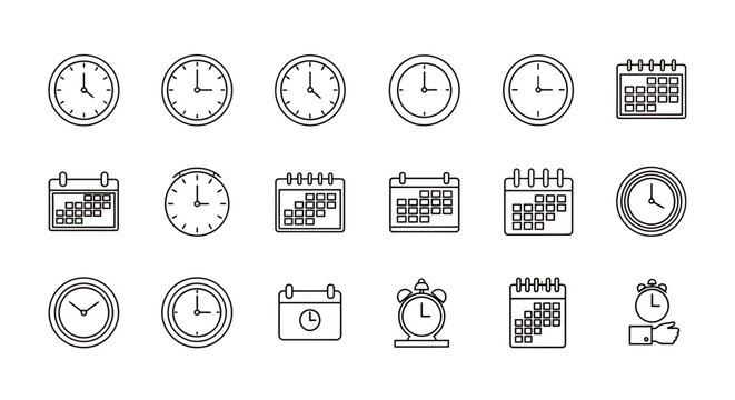 A versatile set of minimalist line art vector icons featuring clocks and calendars, ideal for representing time management, planning, and event scheduling.