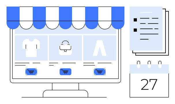 Computer screen displaying an online store with product categories and shopping carts, accompanied by task checklists and a calendar. Ideal for ecommerce, planning, retail, organization, scheduling