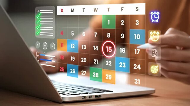 Digital calendar with a laptop : Hands interact with a virtual calendar displayed on a modern laptop, highlighting the concept of scheduling and time management, blending technology with daily life