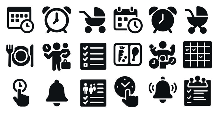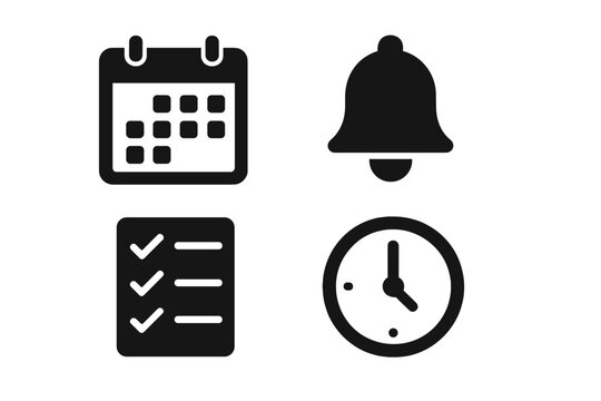 Time management icons set, solid filled vector collection of productivity tools including calendar, reminder bell, checklist, clock, and stopwatch for organization and scheduling
