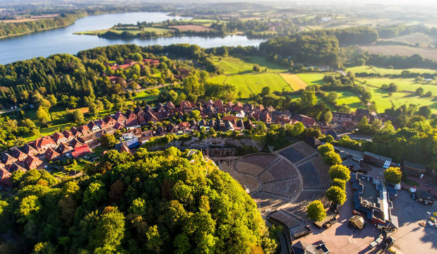 Beautiful Schlei region in Germany, Schleswig Holstein. German landscape in summer. Schlei river and typical houses with thatching, water reed roofs. Sieseby village
