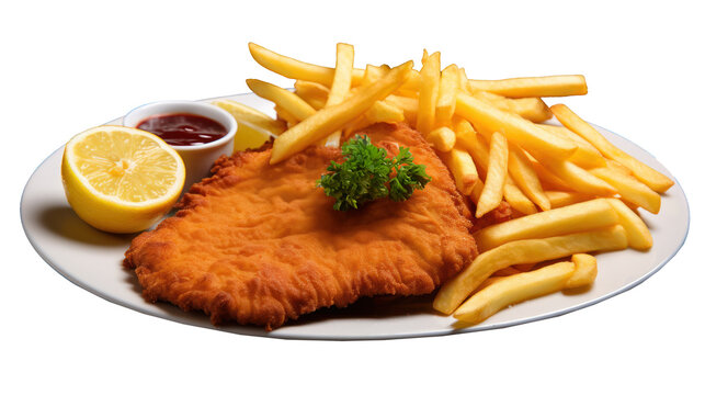 Fried Wiener schnitzel from veal topside with French fries. Generative AI