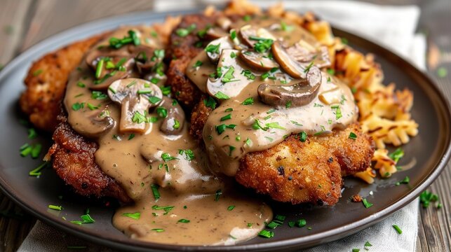 Plate of traditional schnitzel with mushroom sauce. Generative Ai