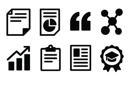 Research Publications silhouette set: science paper, report page, citation icon, molecular structure, data visualization, clipboard, article layout, scholar seal.