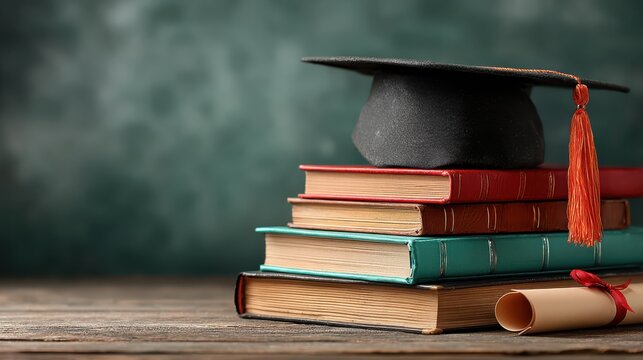 Stack of books topped with a graduation cap and pencil evokes a sense of academic achievement and scholarly pursuits ready for new beginnings.
