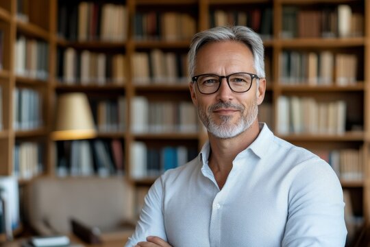 A mature man with a well-groomed beard poses confidently in a library, indicating a deep connection to knowledge and scholarly pursuits in an elegant setting.
