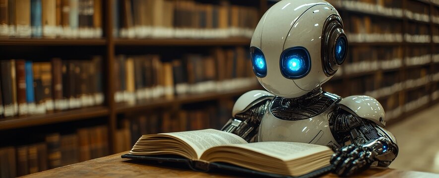 In the serene library, a robot engrossed in a book signifies the convergence of technology and scholarly pursuits