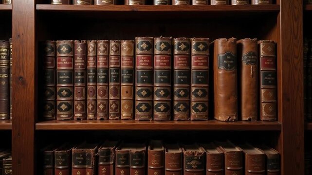 Antique library books on a wooden shelf evoking history, knowledge, and scholarly pursuits