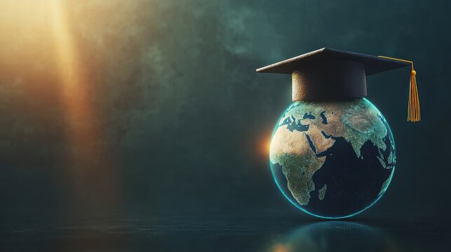 Conceptual image depicting a glowing digital earth wearing a traditional graduation cap symbolizing global academic achievement and worldwide scholarly pursuits in dark atmosphere
