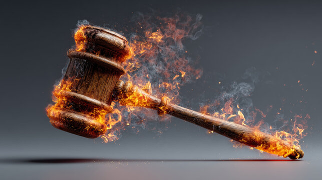 A burning gavel floating in mid air, isolated on grey background. Concept of unfairness, finalization