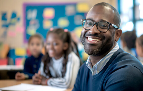 smiling black male teacher against the background of students involved in primary school education, ideal for school advertising materials, educational campaigns and teacher recruitment announcements.