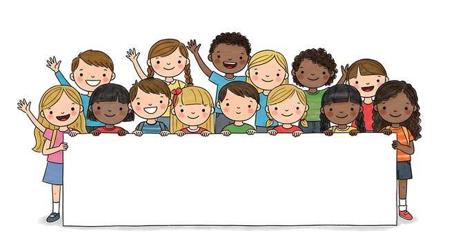 Diverse group of children holding blank banner illustration for school project or advertising campaign
