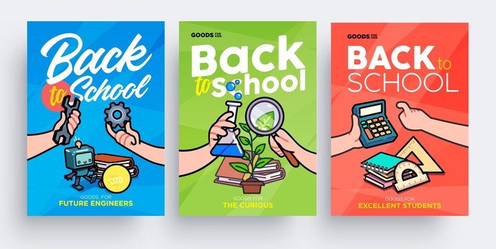 Set of Back to School greeting cards, posters or flyers. Сhildren's hands holding school supplies. Template for stationery store