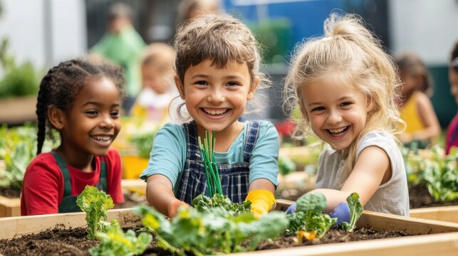 Children group girl and boy of diverse learning environment for plants vegetable at garden farm, Cute child learn gardening, Ecology, organic food, agriculture school learning
