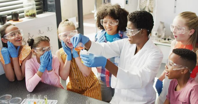 Group of Pupils in white gown doing a chemical experiment in laboratory at school . kids in science lab study using pipette dropping liquid to test tube. multi ethnic . asian ,caucasian, biochemistry
