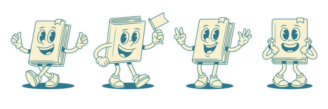 Comic funny childish book cartoon character emoji set vector illustration. Cute smiling minimalist textbook literature library mascot greeting flag astonished surprise positive emotion